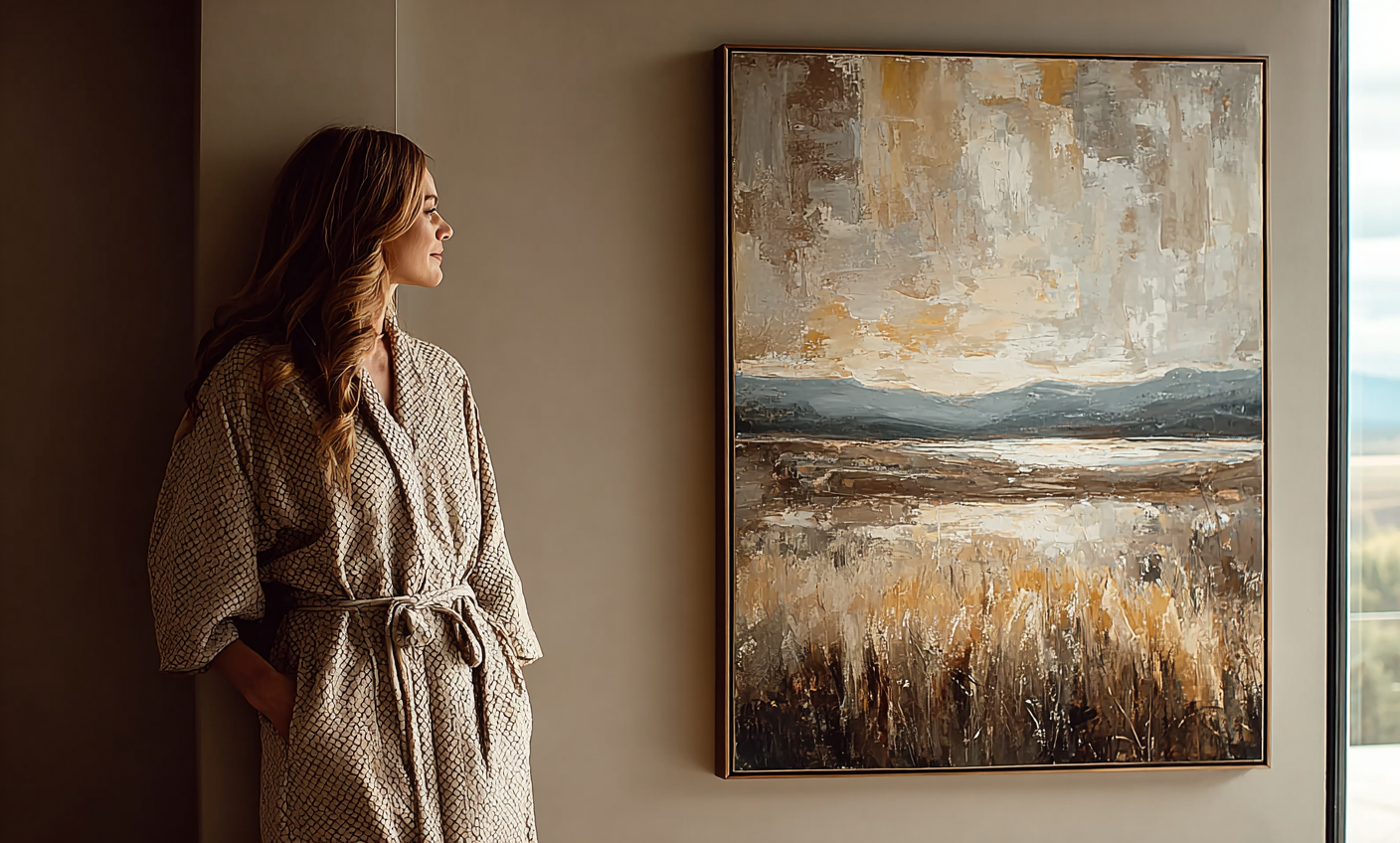 Finally, the moment of arrival. Once hung, the painting transforms your wall and space, infusing it with personality, light, and the quiet power of creation.
